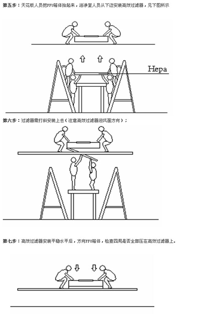 4、吊頂天花板上的安裝人員把FFU箱體抬起來(lái),地面安裝人員從下邊安裝高效過濾器。